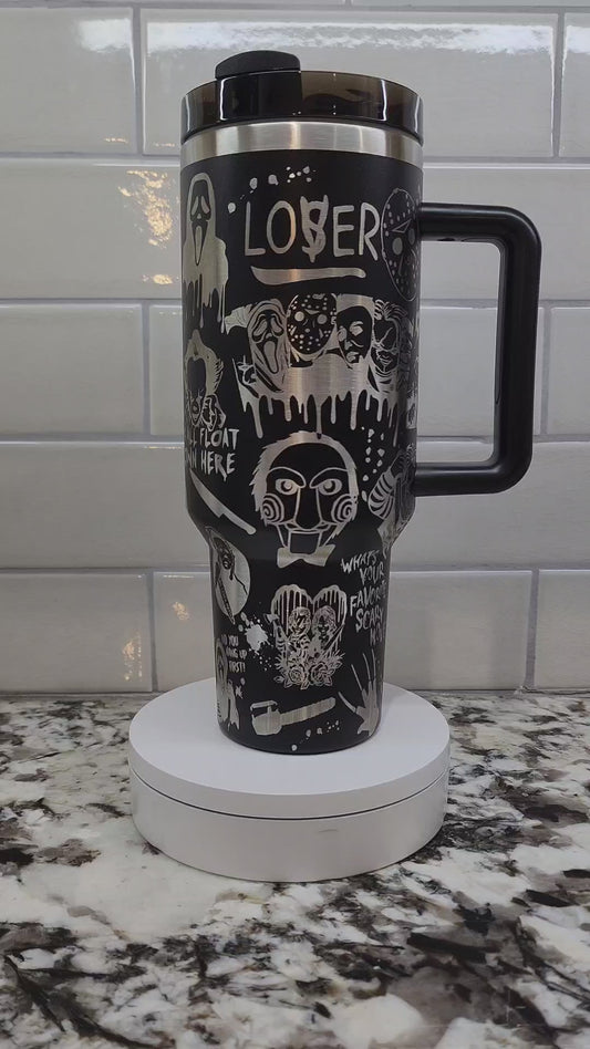 Halloween Horror Characters Themed Engraved 40oz Tumbler | Custom Insulated Travel Mug | Spooky Horror Lover Gift