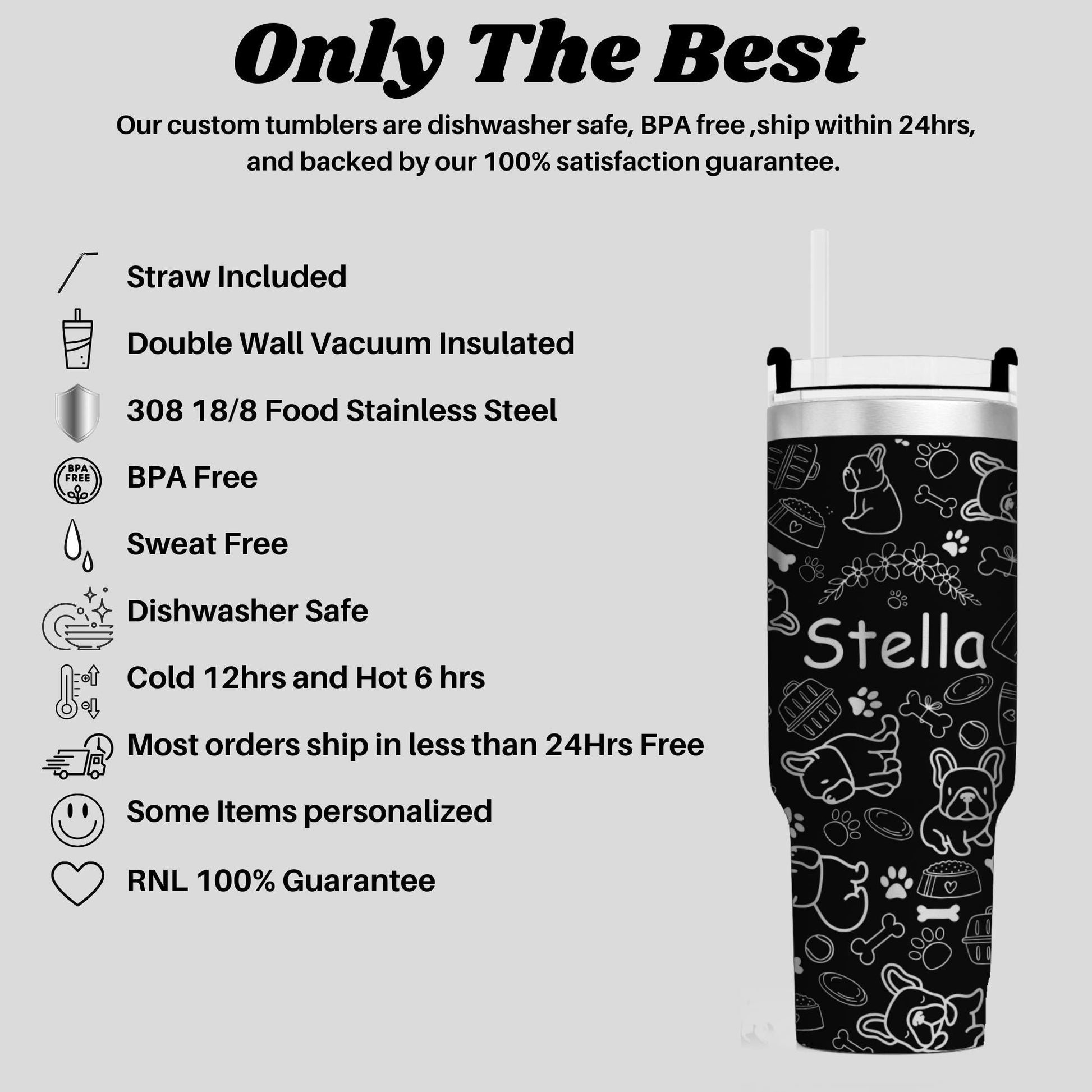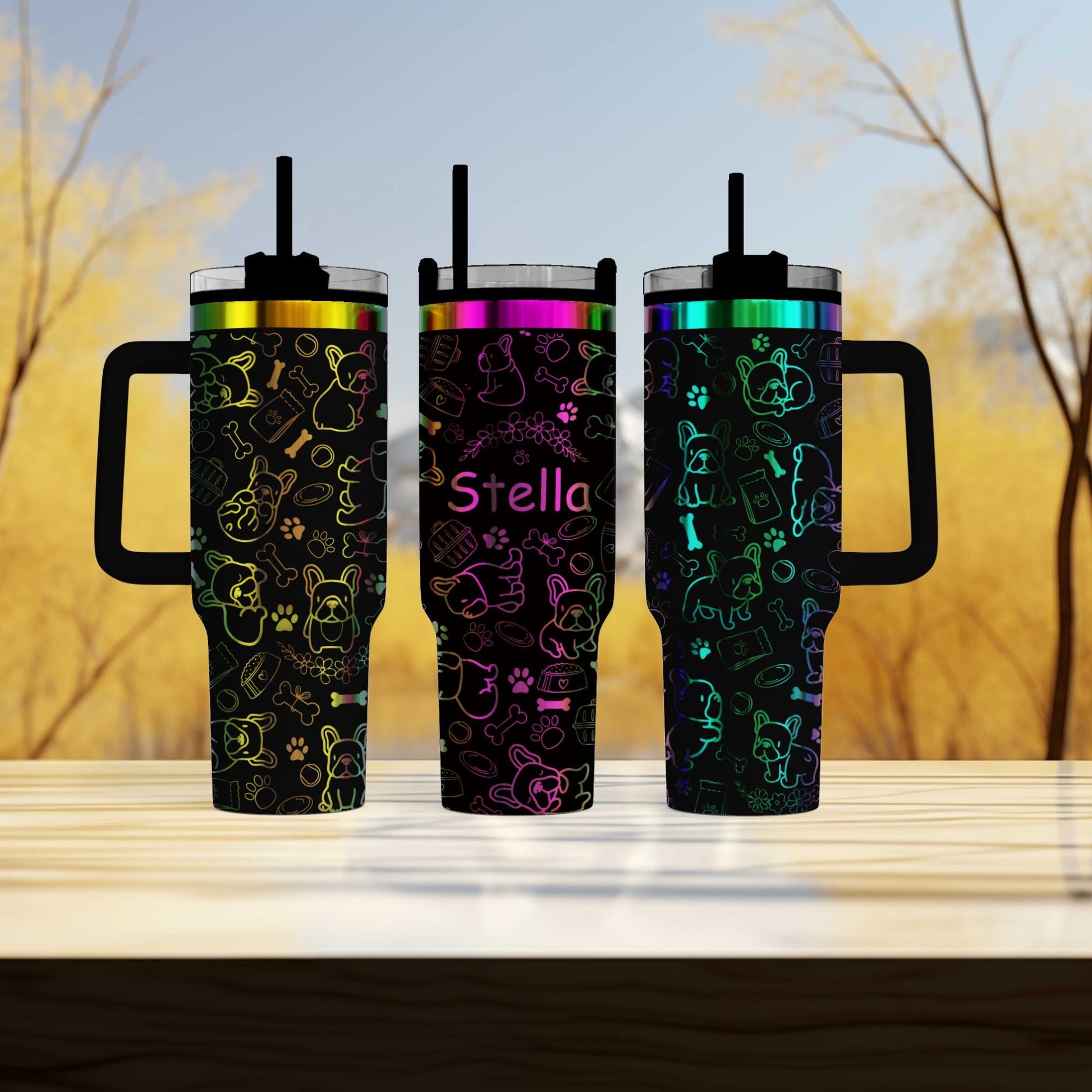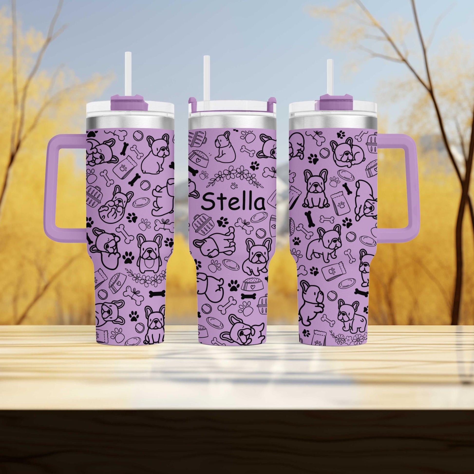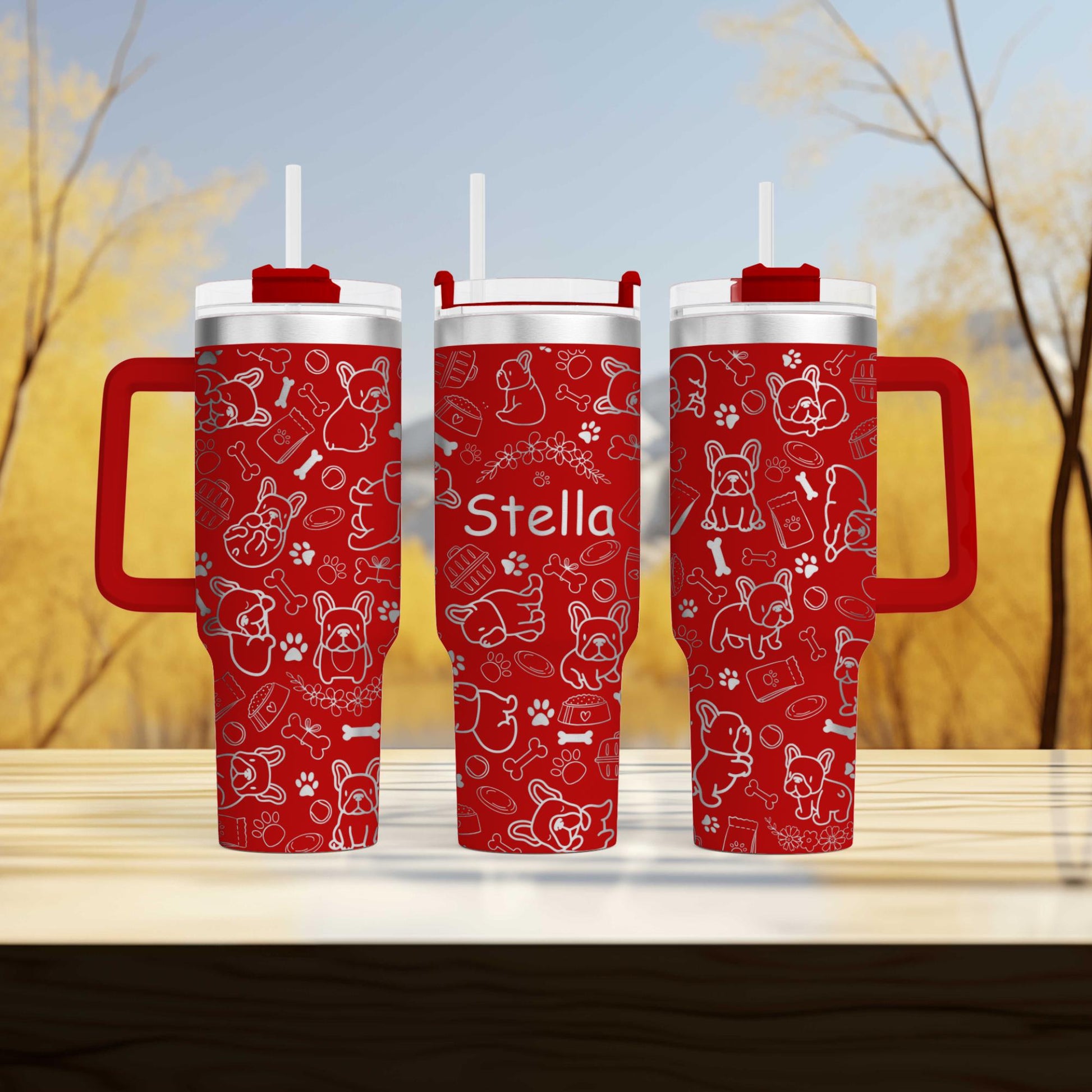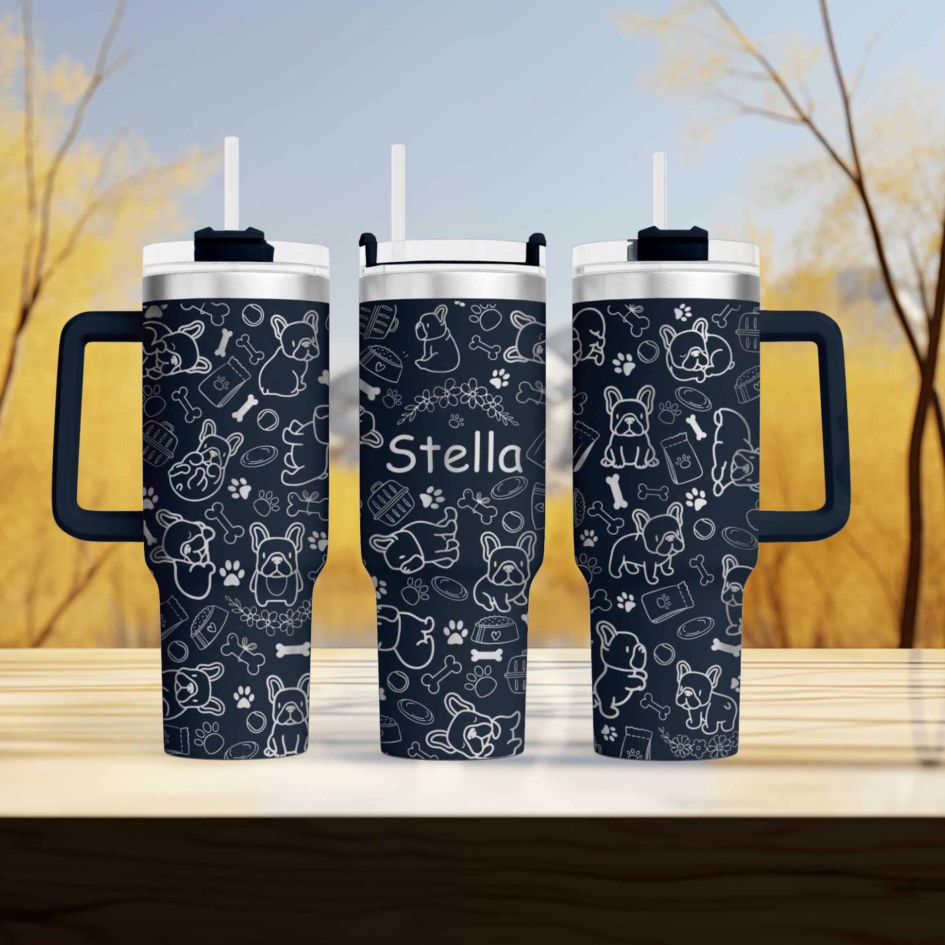 Adorable French Bulldog Pattern: Engraved with cute and playful French Bulldog designs, this tumbler celebrates your love for these charming pups. Each sip is a reminder of your four-legged friend's cuteness!