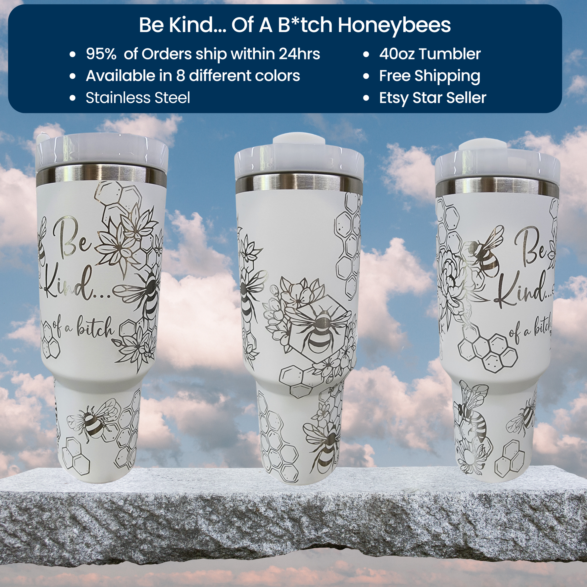 Embrace your inner queen bee with our Honey Bee Themed Engraved 40oz Tumbler, featuring the sassy saying "Be Kind of a Bitch". This custom-insulated travel mug is perfect for bee lovers and those who appreciate a touch of humor in their drinkware.